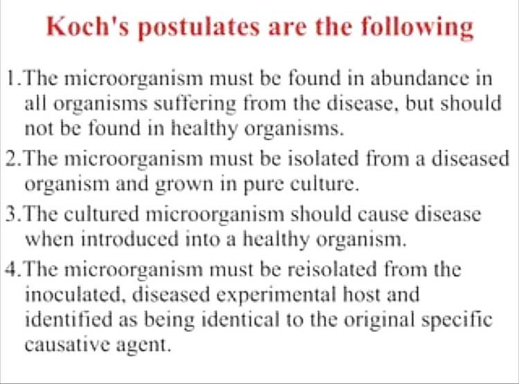 “Koch defined four famous criteria which are now known as Koch’s postulates, which are still generally regarded as the best proof that an infectious agent—cellular or viral—is responsible for a specific disease.”