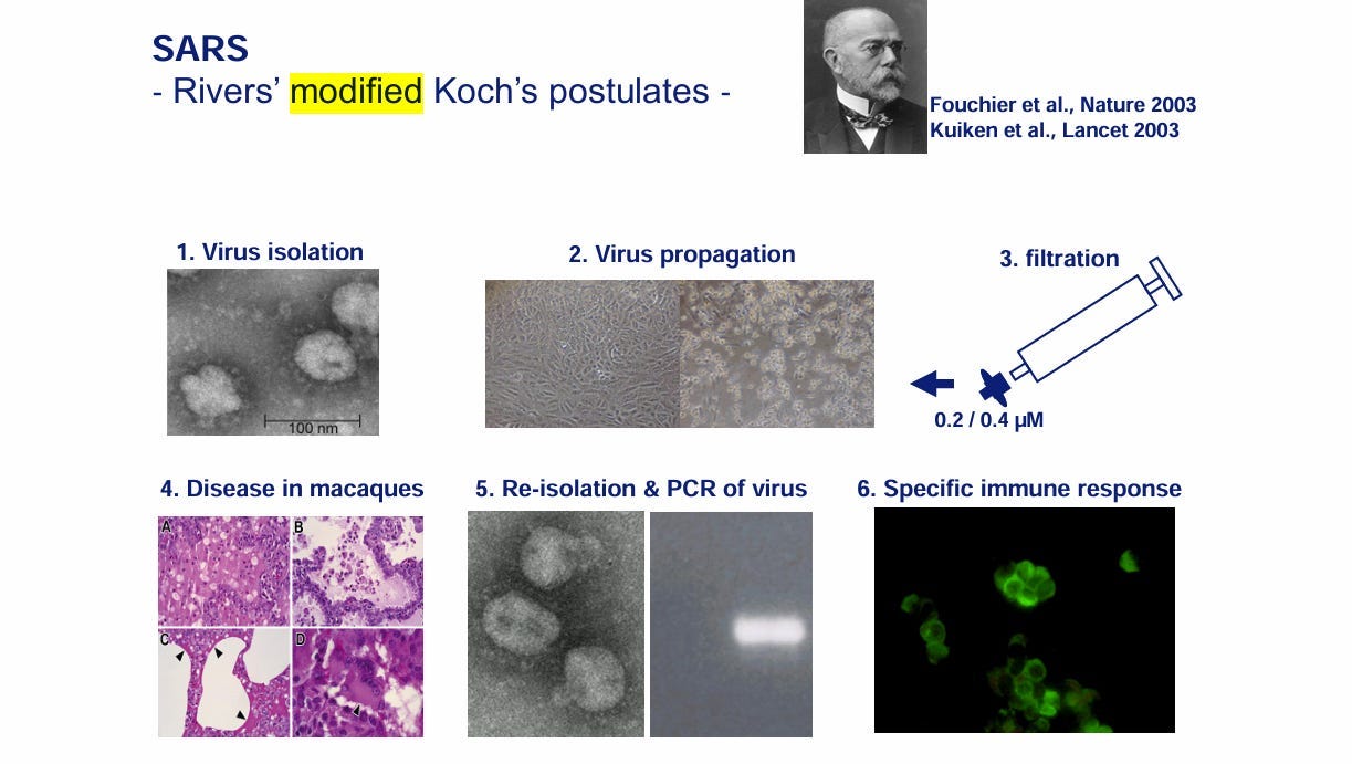 September 2012 – Ron Fouchier, one of the very same virologists involved, said in an interview about the new coronavirus: “To show that it causes disease you need to fulfill Koch’s Postulates. That’s what we did for SARS.” Again: Koch’s, not Rivers’.