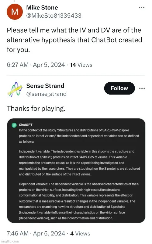Jeff chose to remain in a self-reinforcing loop to avoid substantiating his positive claim, knowing he could not. This highlights precisely why I no longer engage with people who refuse to debate honestly or scientifically—it’s a complete waste of time and effort. If Jeff wishes to remain locked in his “virus” solvent fantasy, that’s his choice, but it’s not a discussion worth continuing.