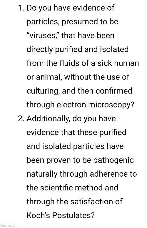 You have refused to provide the absolutely necessary scientific evidence I asked for: a purified, isolated "viral" particle demonstrated directly by EM/biochemistry prior to culturing, and then shown to cause disease in a host under controlled conditions in accordance with the scientific method and the satisfaction of Koch's Postulates.